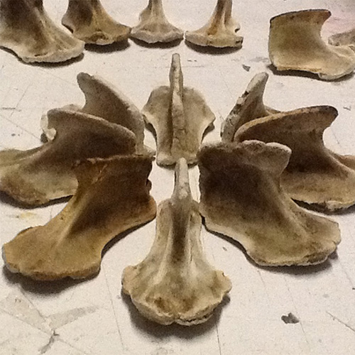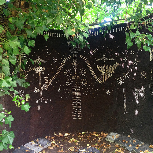 THE RELICS OF A THOUSAND CHICKEN SOUPS. COLLECTED, CLEANED AND THEN SORTED, THESE BONES DECORATE THE MUD WALL IN THE DARK CORNER OF THE GARDEN. AND THE 'PLANT CEMETERY', WHERE OLD SHRUBS ARE COMMEMORATED IN THEIR OWN GRAVEYARD.