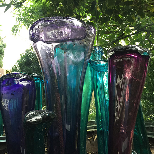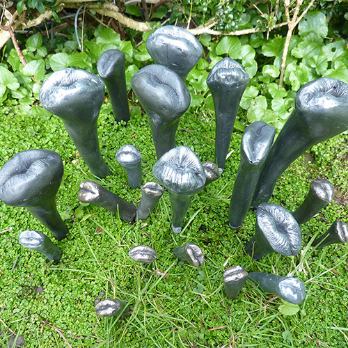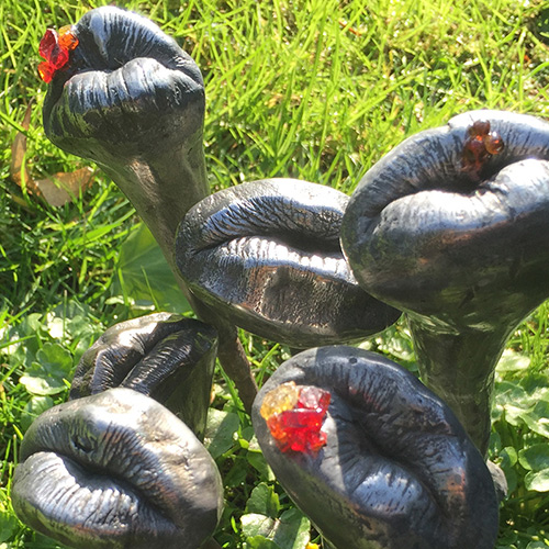 FLOWERING IN UNLIKELY PLACES AND UNLIKELY SIZES ARE LIPS IN COLOURED GLASS AND ALUMINIUM. SEVERAL BEJEWELLED WITH RUBY COLD SORES, THEY TAKE ROOT ACROSS THE LAWN.